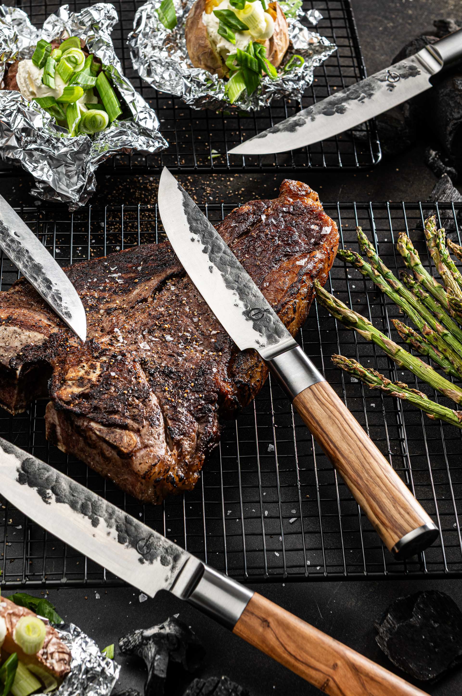 Das Forged Olive Steakmesser Set XXL (4-teilig) bringt echtes Steakhouse-Feeling auf deinen Tisch. Die extra großen Steakmesser werden aus japanischem Stahl von Hand geschmiedet, besitzen eine ca. 2 mm starke, fein geschliffene Klinge und sind auf rund 58 Rockwell gehärtet – ideal, um auch dicke Steaks, Tomahawks oder Rib-Eyes mühelos zu schneiden. Die warm gemaserten Griffe aus Olivenholz liegen ergonomisch in der Hand und machen jedes Messer zum Blickfang auf der Tafel. Perfekt für Grillabende, BBQ-Sessions und alle Fleischliebhaber, die Wert auf kraftvolle Optik und saubere Schnitte legen. Das 4er-Set wird in einer hochwertigen Holzbox geliefert und ergänzt die übrigen Messer der Olive-Serie ideal. Erhältlich bei Feuershop.de.