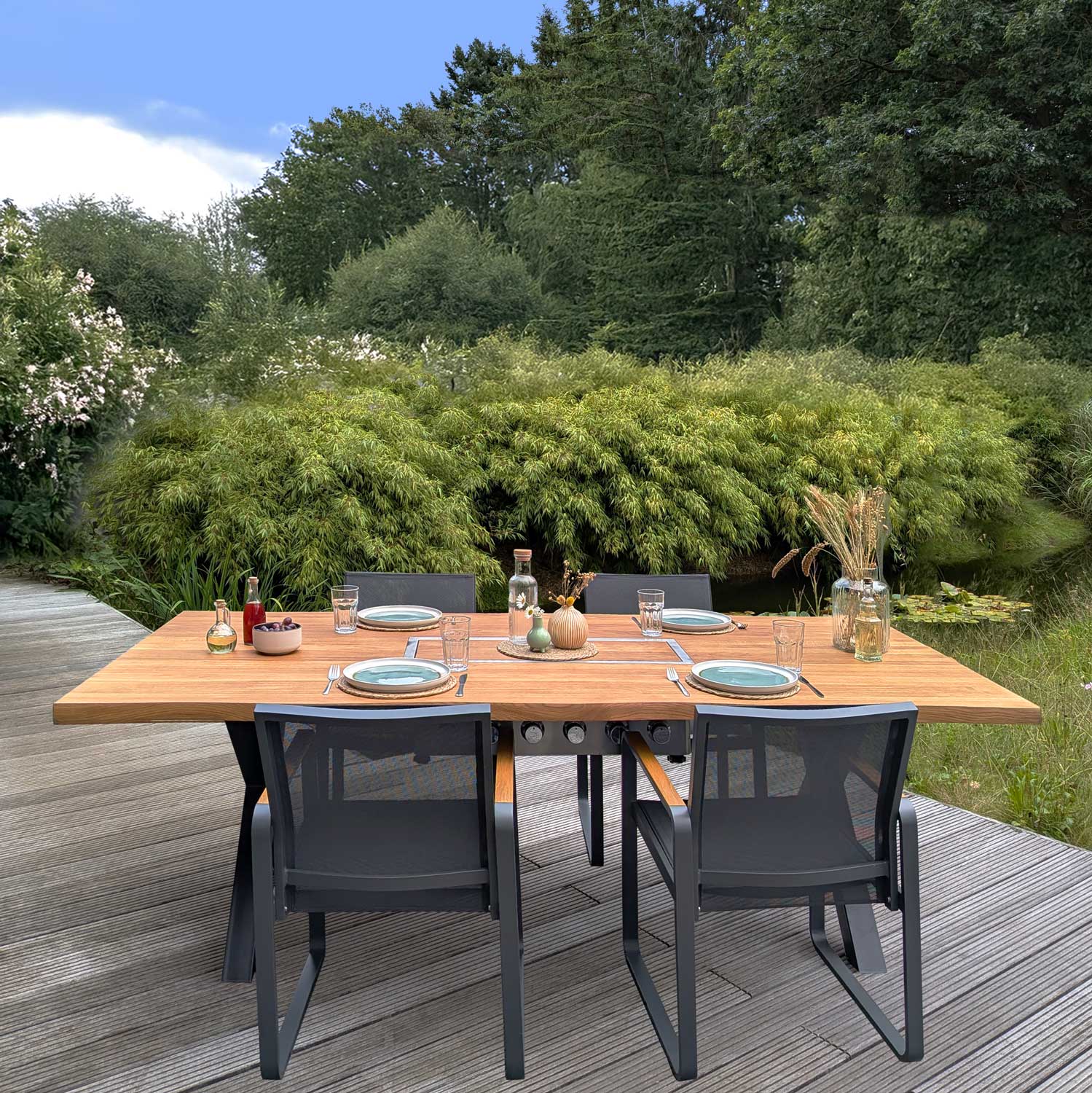 Grill mit 6 Brennern und Glas-Abdeckungen, Grilleinsatz, 3 herausnehmbare Edelstahlroste, Eichen- oder Walnusstisch in ausgewählter Größe mit schwarzen Edelstahl-X-Beinen, Holz-Inlet mit eingelassenen Magneten und 2 Stk. Holz-Griffe mit Magneten zum Herausheben des Holz-Inlets, Outdoor-Cover zum Abdecken des Tisches