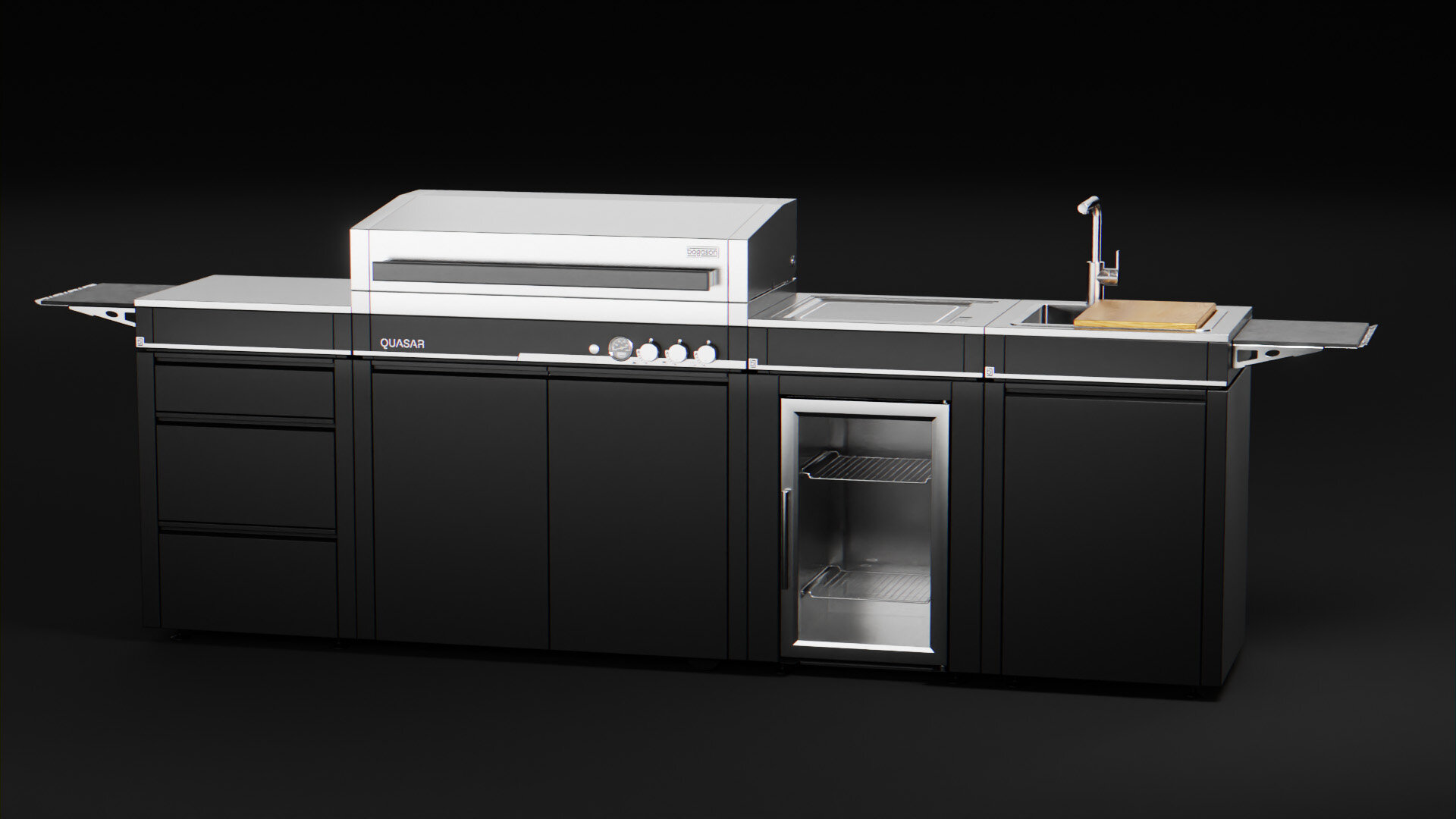 - Kühlschrank-Modul: Platz für den 63-L BBQ-Cooler inkl. LED-Innenbeleuchtung – kalte Drinks & Zutaten griffbereit.