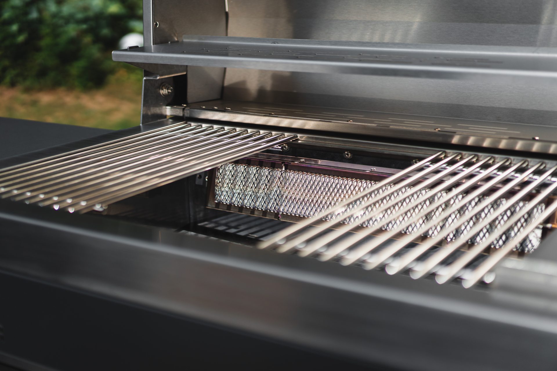 Im Alltag ist das Besondere beim Quasar die Brenner-Anordnung: Die zwei Hauptbrenner stehen vorne und hinten, dadurch grillst du in der Mitte sehr gleichmäßig indirekt über Infrarotstrahlung – das hilft, damit Fleisch saftig bleibt und Fett nicht ständig aufflammt, weil es nach unten in die Fettauffangschale tropft. Für das Finish nutzt du die Randbereiche mit direkterer Hitze. Die Hauptgrillfläche hat 2835 cm², dazu kommt die Sizzle Area, bei der ein 3,5 kW Brenner für Temperaturen von bis zu max. 800°C sorgt. Insgesamt liegen die zwei Hauptbrenner bei 12 kW plus den Brenner der Sizzle Area mit 3,5 kW.